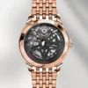 Çift Taraflı Şeffaflık (Double-Sided Skeleton): Saatin kalbini ve hareketli mekanik parçalarını her iki yönden de (önden ve arkadan) tamamen görünür kılan bu tasarım, ince el işçiliğiyle süslenmiş parçaların kusursuz uyumunu ve doğa motiflerini gözler önüne serer.