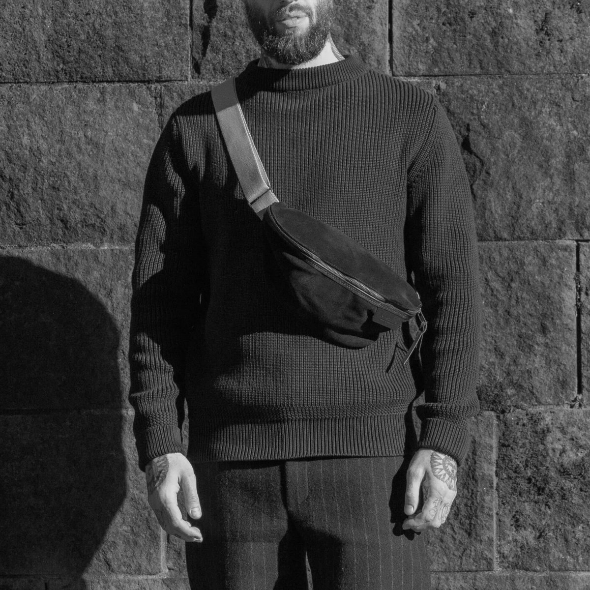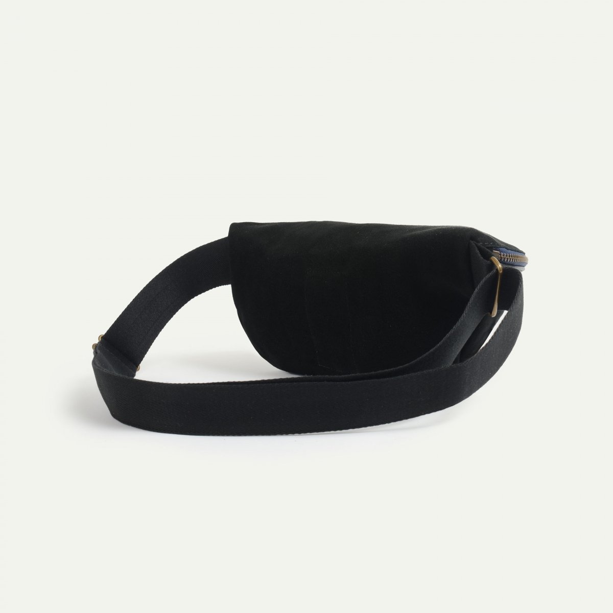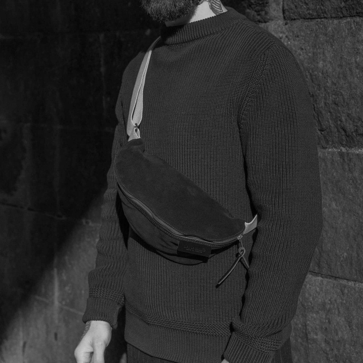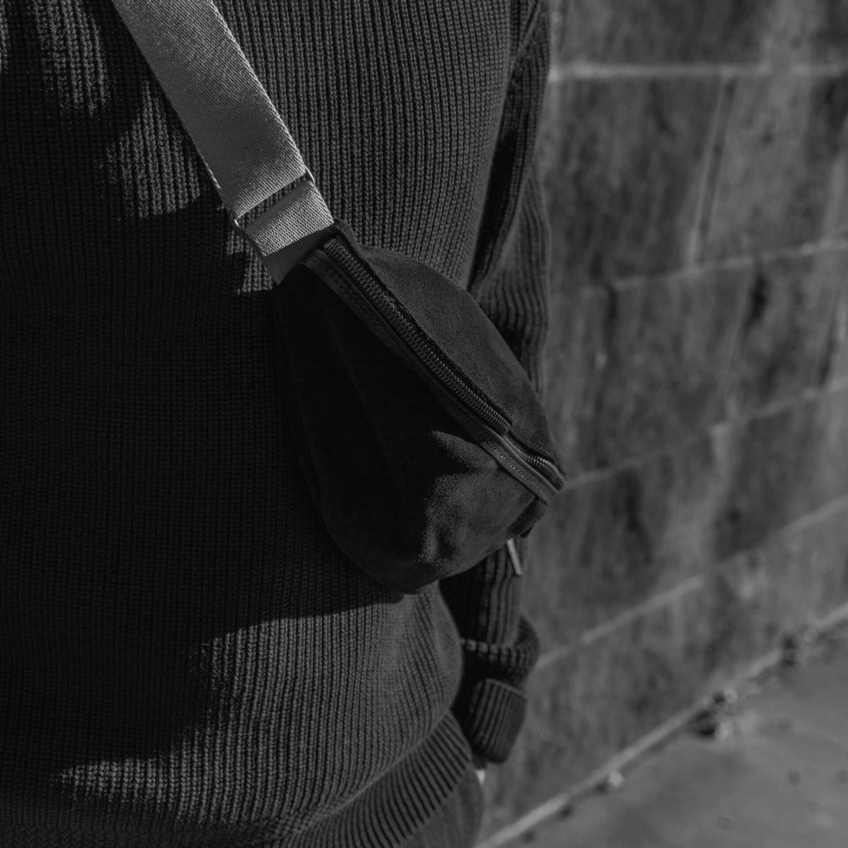 Suede Noir (Siyah Süet) gövdesi, kadifemsi ve yumuşak bir dokunma hissi sunarken; askı ve detaylarda kullanılan bitkisel tabaklanmış (vegetable tanned) siyah deri, çantaya endüstriyel ve dayanıklı bir karakter kazandırır.
