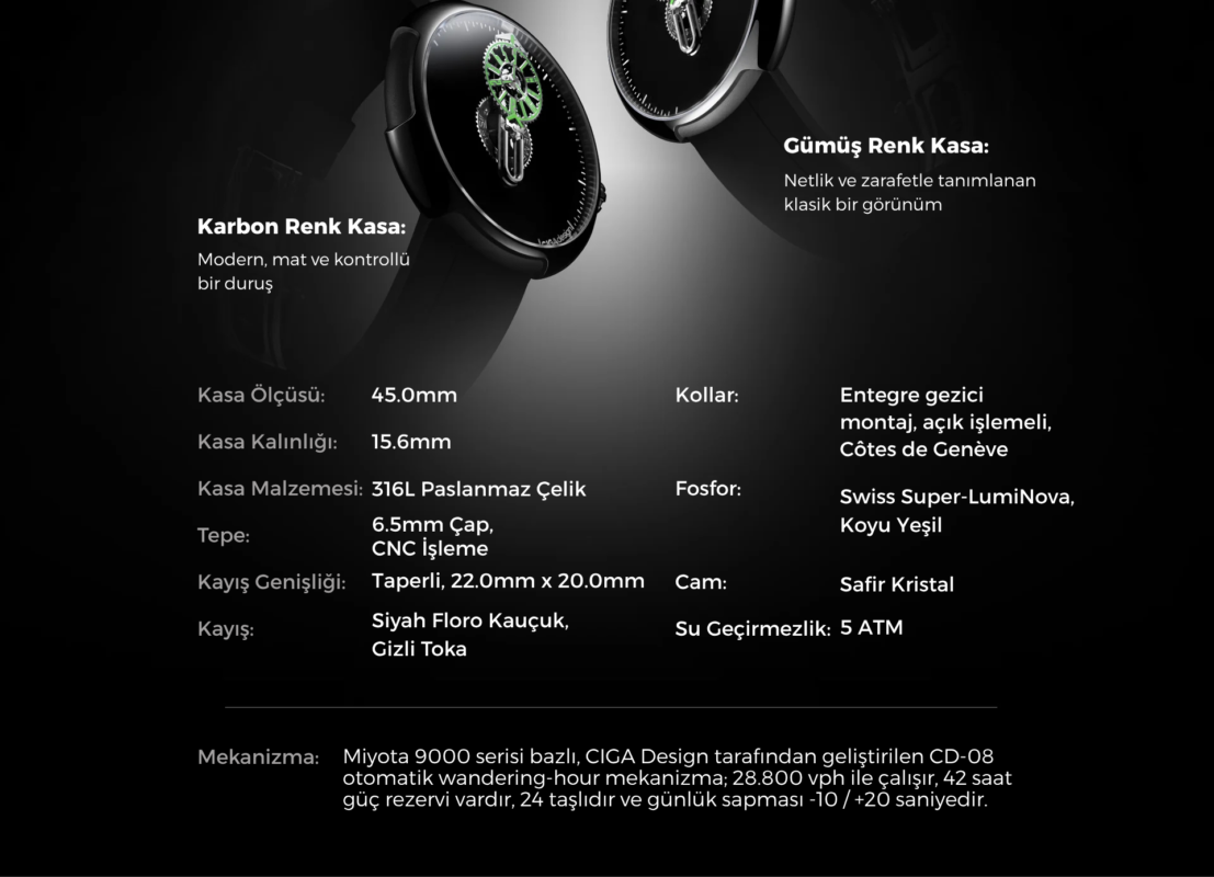 Tam Set Gönderim: Saatiniz; CIGA design’ın özel tasarım orijinal kutusu, kullanım kılavuzu ve garanti belgesi ile birlikte eksiksiz olarak gelir.