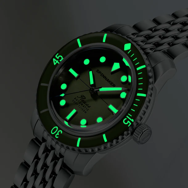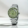 Pine Crest Kadran: Işığın açısına göre canlanan bu eşsiz koyu yeşil ton, güçlü fosforlu indeksler ve altın/çelik tonlu ibrelerle tamamlanarak gece veya su altında mükemmel okunabilirlik sağlar.