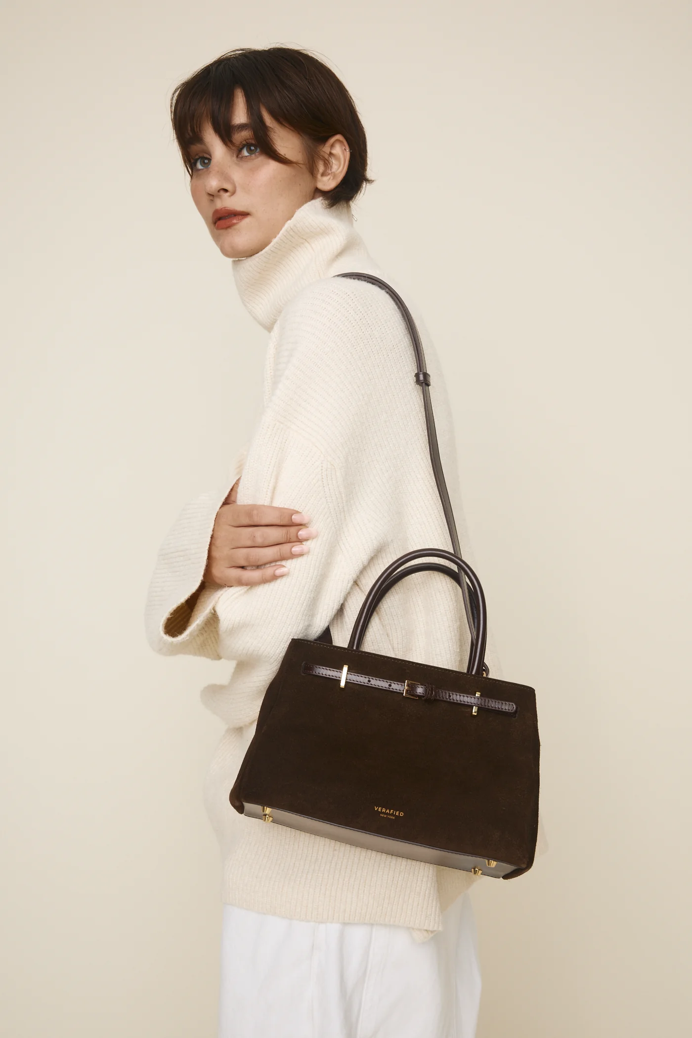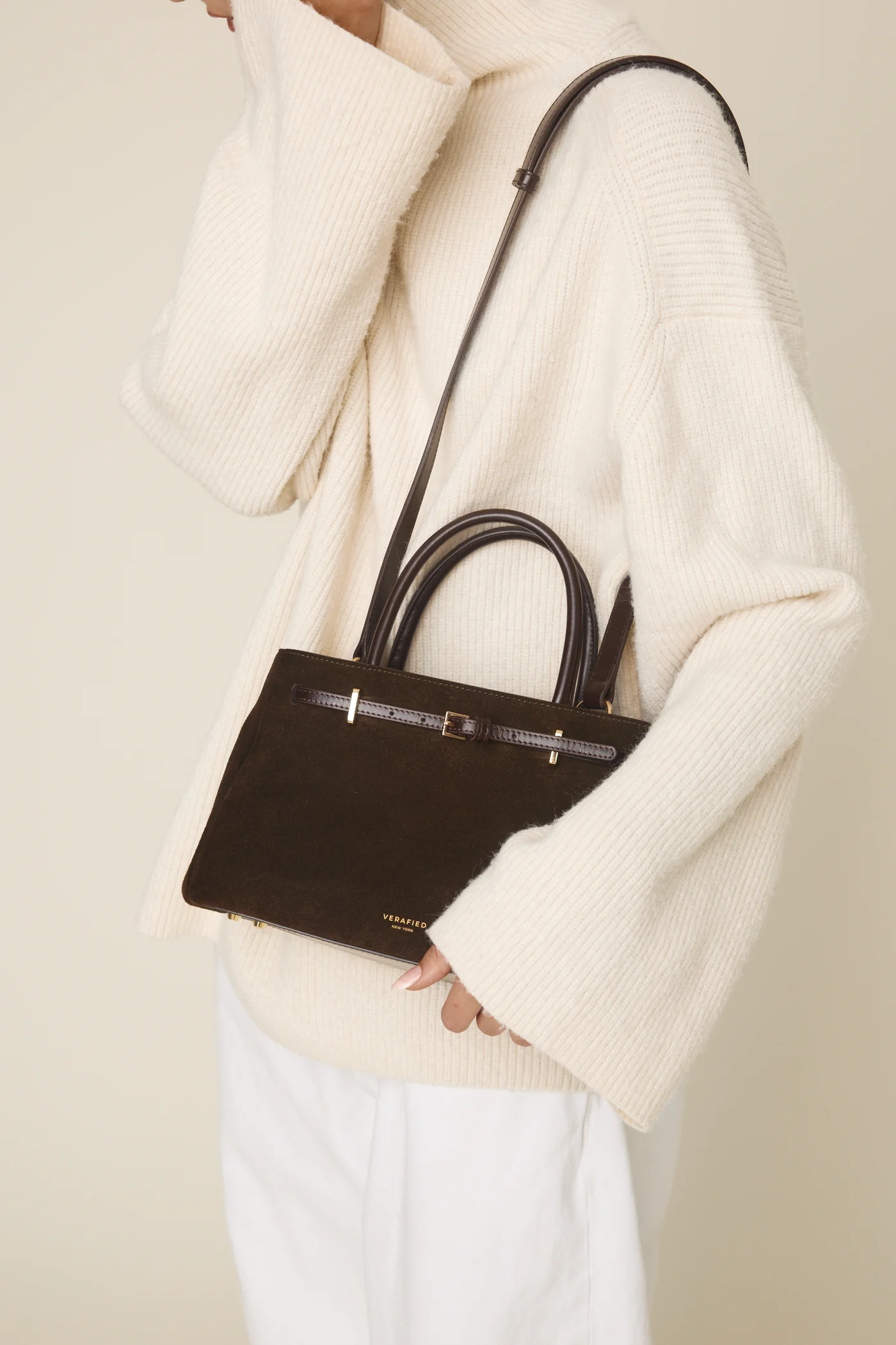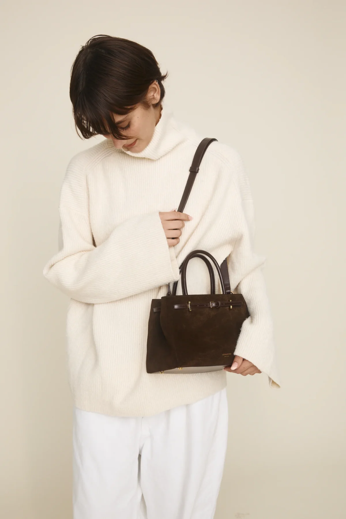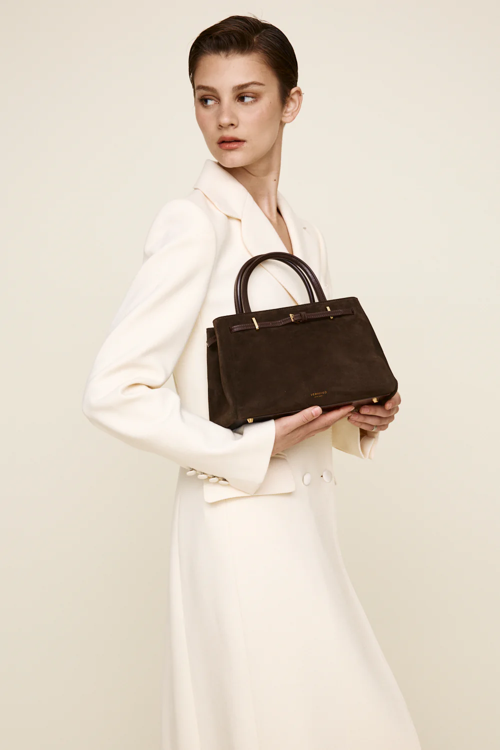 Verafied’in slow fashion yaklaşımı doğrultusunda bu model, hızlı tüketim yerine uzun süreli kullanım için tasarlanmıştır. Süet malzemenin zamanla kazandığı doğal patina, çantaya karakter katar.